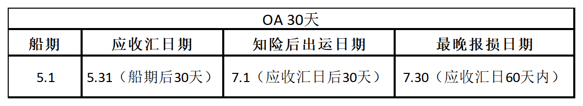 下面我们以表格的形式来总结一下上述三个日期的分布。责任生效日为5月1日,应收汇日期应为5月31日,知险后出运日期应为7月1日,最晚报损日期应为7月30日。
